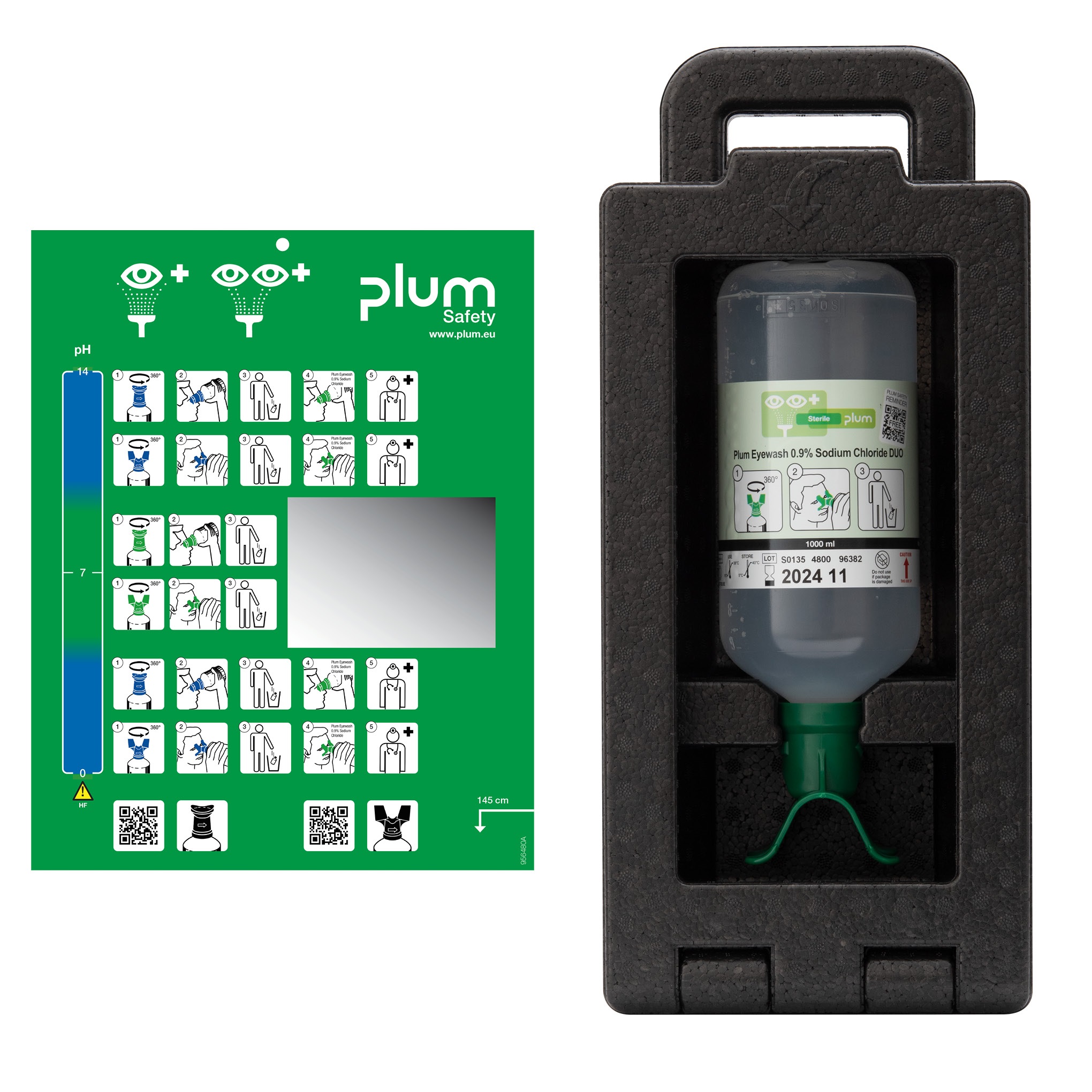 Plum iBox je stanica za organizirano postavljanje jedne bočice za ispiranje oka. Uključena DUO otopina od 500 ml omogućuje brzo ispiranje oba oka ili ciljano ispiranje nakon kontaminacije.